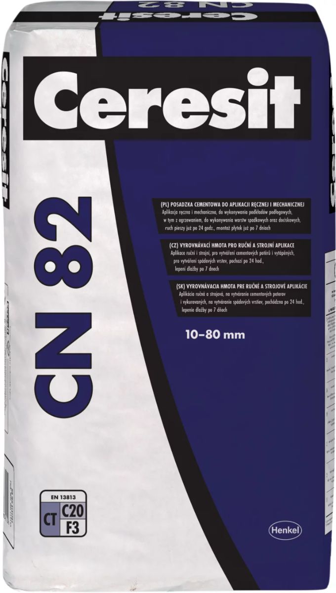 Ceresit CN 82 is a cementitious levelling compound designed for manual and mechanical application of floor screeds with thicknesses from 10 to 80 mm. It is suitable for forming bonded, unbonded and floating screeds on cementitious substrates. The product provides good workability, controlled setting and reliable strength development, making it suitable for residential and commercial floor constructions.