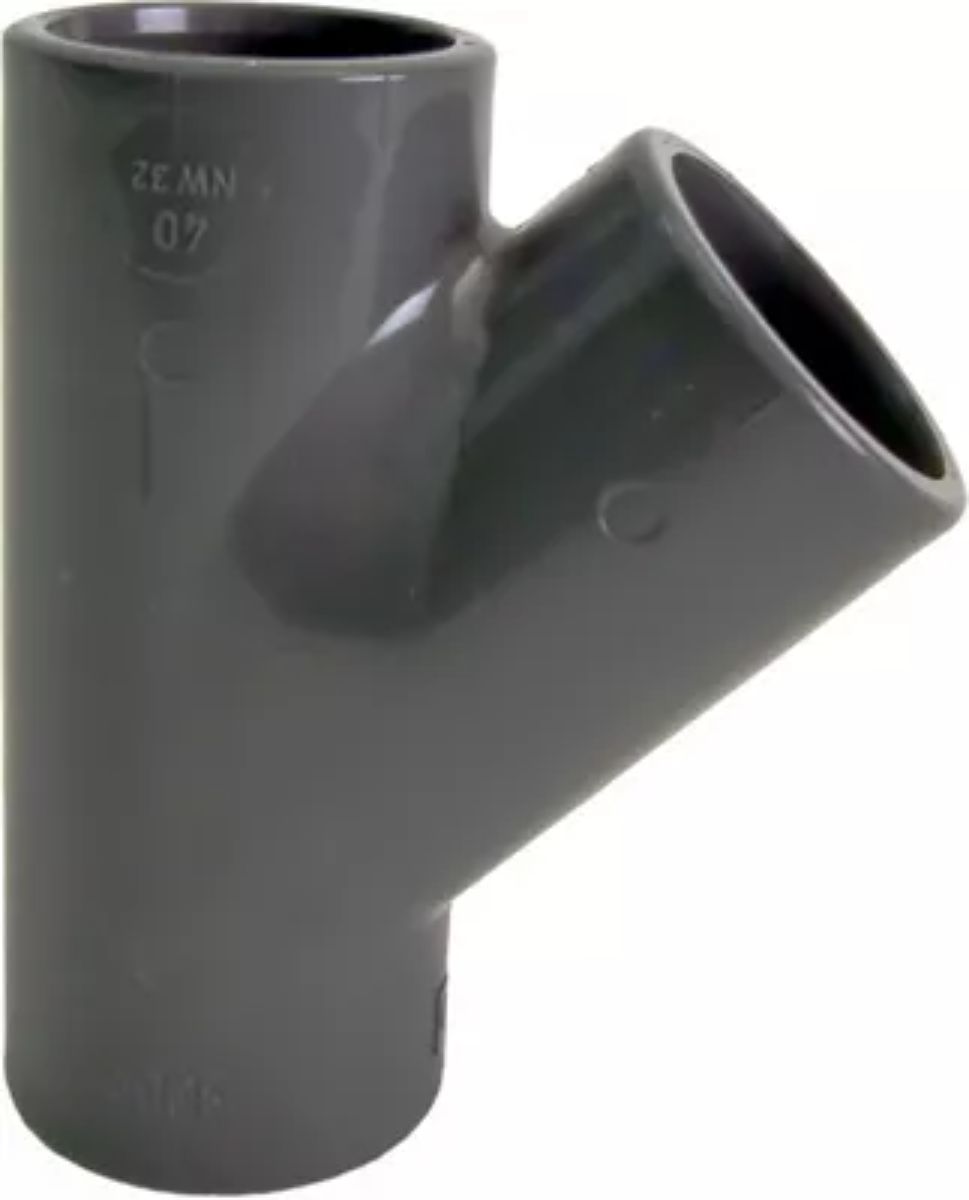 PVC-U tee with a 45-degree branch designed to connect three pipe runs in drainage piping systems. The fitting is provided in metric and BS sizes. Dimensional values are defined per size in the manufacturer datasheet. Pressure rating values are stated per size in the datasheet.